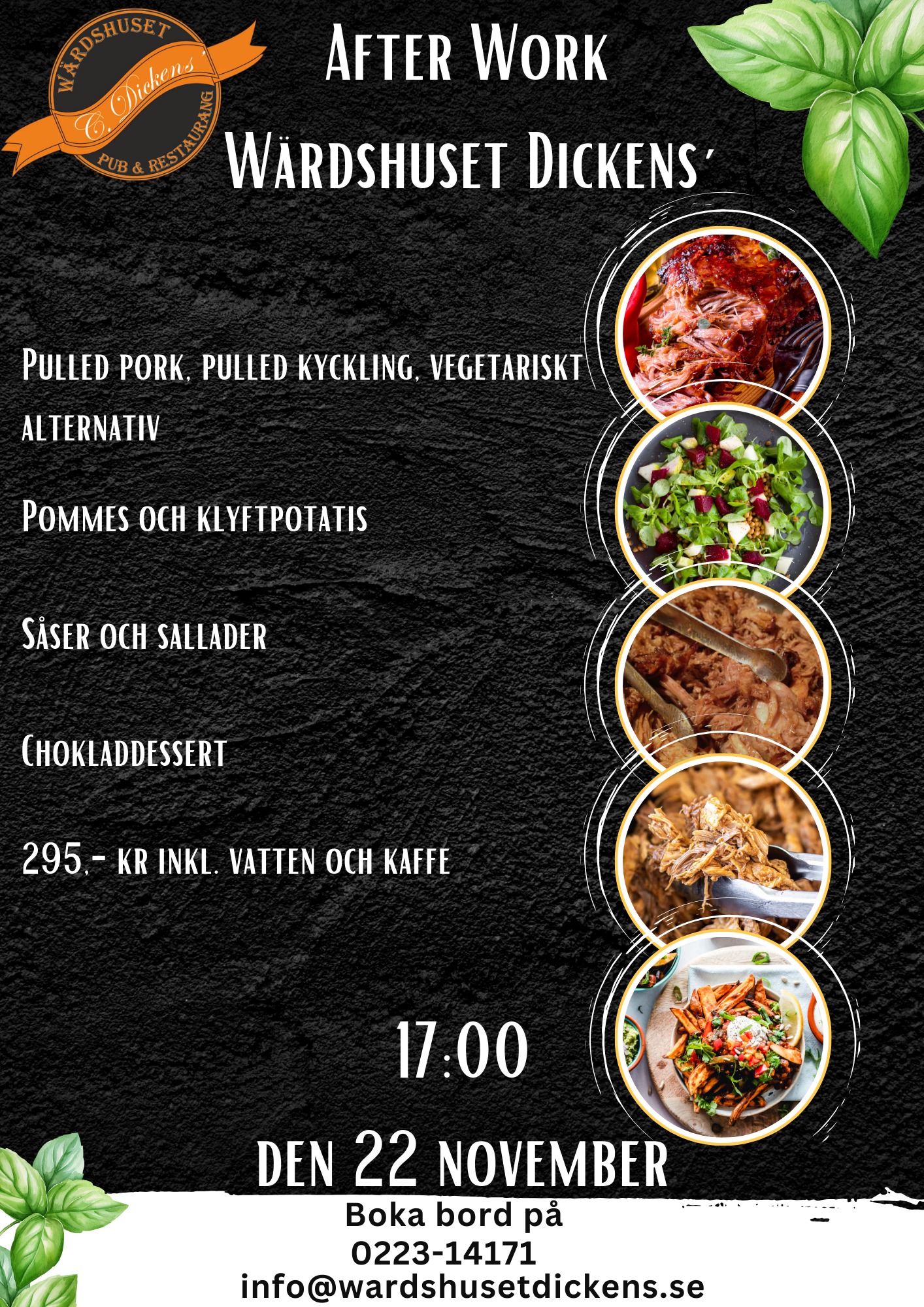 oktober 10, 2024 Dags igen för After Work fredagen den 24 januari. Från 17:00 och öppet till 23:00. Boka bord på 0223-141 71 eller info@wardshusetdickens.se Varmt välkomna Dickens’ Managment Team